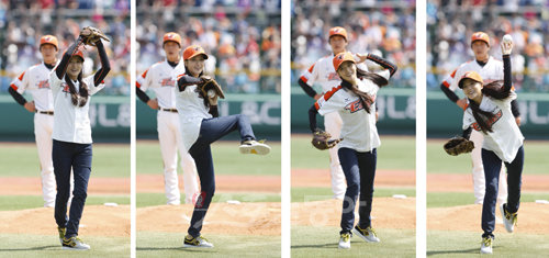 2011 프로야구 한화이글스 대 SK와이번스 경기가 5일 대전한밭야구장에서 열렸다. 경기 전 탤런트 김희선이 어린이날을 맞아 시구를 하고 있다.