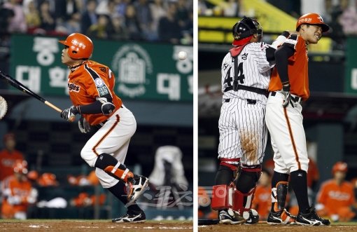 LG 리즈 눈에도 전날 한화 최진행의 3연타수 홈런이 무서웠던 모양이다. 11일 7회초 1사 1루에서 최진행이 리즈가 던진 볼에 등을 강타 당했다(왼쪽). 최진행의 얼굴이 일그러지자 LG 포수 조인성이 급히 어깨를 주무르며 기분을 풀어주고 있다(오른쪽).