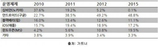 MS는 애플 iOS와 구글 안드로이드에 대항하기 위해 윈도우 모바일을 과감하게 버리고 윈도우폰7을 새로 선보였지만, 아직도 갈 길이 멀다. 실제 현재 윈도우폰7의 전세계 점유율도 약 4%에 불과하다. 꾸준하게 점유율을 늘리고 있는 애플 iOS와 폭발적인 성장을 거듭하고 있는 구글 안드로이드 진영에 비하면 초라한 성적표다. 그런데 최근 시장조사업체 가트너가 재미있는 통계 자료를 내놓았다. 휴대폰 시장 1위 자리를 차지하고 있던 노키아와 MS의 제휴 효과로 오는 2015년이면 윈도우폰7이 안드로이드, iOS에 대항할 수 있을 정도로 성장한다는 것(아래 표 참고). 이는 최근 미국 내에서 윈도우폰에 대한 기대가 반영된 결과다.