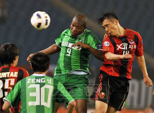 FC서울 방승환(맨 오른쪽)이 11일(한국시간) 항저우 그린타운(중국)과의 2011아시아축구연맹(AFC) 챔피언스리그 조별리그 F조 최종전에서 상대 선수에 앞서 공중 볼을 따내고 있다.
