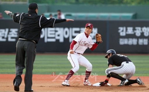 13일 서울 목동야구장에서 열린 '2011 프로야구' LG 트윈스와 넥센 히어로즈의 경기에서 1회초 LG 공격, 무사 1루 주자 이대형이 이진영의 타석 때 2루 도루에 성공하고 있다.