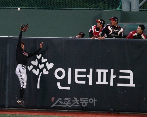 13일 서울 목동야구장에서 열린 '2011 프로야구' LG 트윈스와 넥센 히어로즈의 경기에서 3회말 넥센 공격, 넥센 강병식의 타구를 LG 이진영이 처리하고 있다.