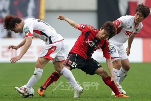 15일 오후 3시 서울월드컵경기장에서 열린 ‘현대오일뱅크 K리그 2011’ FC서울과 경남FC의 경기 에서 FC서울의 고요한이 경남FC의 이훈과 볼을 다투고 있다.