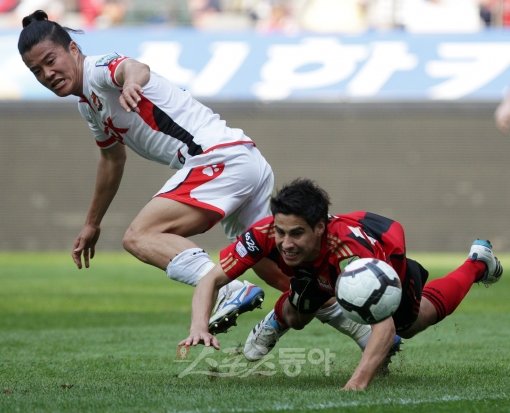 15일 오후 3시 서울월드컵경기장에서 열린 ‘현대오일뱅크 K리그 2011’ FC서울과 경남FC의 경기에서 FC서울의 몰리나가 경남FC의 박재홍과 문전에서 볼을 다투다 넘어지고 있다.