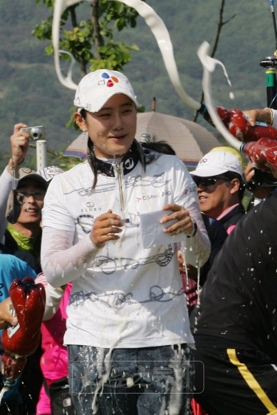 15일 경북 경주 블루원 보문 컨트리클럽에서 열린 한국여자오픈 골프선수권대회에서 생애 첫 우승을 차지한 루키 정연주가 동료들로부터 맥주 축하 세례를 받고 있다.