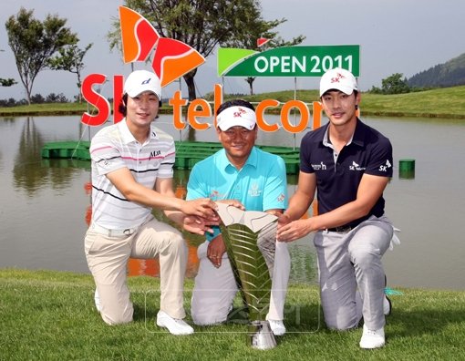 최경주(가운데)와 김대현(왼쪽), 홍순상이 18일 SK텔레콤오픈 우승컵을 두고 기념촬영을 하고 있다.