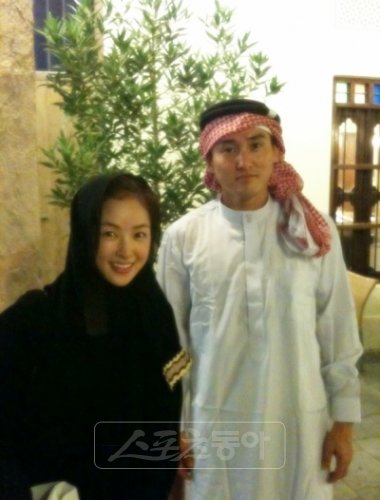 카타르 전통의상을 입고 포즈를 취한 한태윤(왼쪽)·이정수 커플.