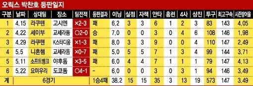 오릭스의 코리안 듀오 박찬호(38)와 이승엽(35)이 동시에 1군 무대에 복귀했다. 박찬호는 쾌투를 펼치면서도 시즌 2승째와 인연을 맺지 못했고, 이승엽은 4번타자로 나서 안타를 때렸다.팀 9회 동점 허용…2승째 못올려