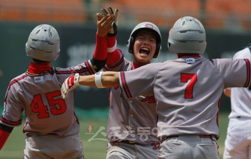 충암고 김태훈(가운데)이 1-3으로 뒤진 5회초 2사 2·3루 찬스서 이진석의 좌전적시타 때 2루에서 홈까지 파고들면서 동점 득점을 올린 뒤 동료들의 환영을 받으며 환호하고 있다. 충암고는 4-3으로 경남고를 물리치고 8강에 올랐다.