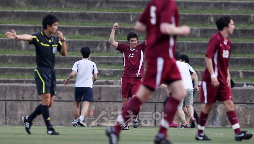 23일 오후 서울 성북구 고려대 녹지운동장에서 고려대와 미국 하버드대학 축구팀 초청 친선경기가 열렸다. 하버드 알렉스최가 동점골을 넣은 후 환호하고 있다.