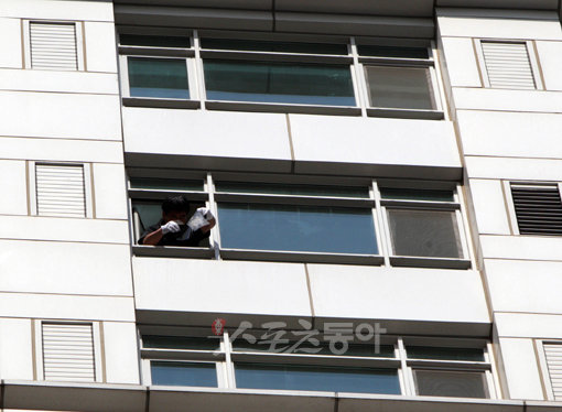 송지선 아나운서가 투신한 23일 오후 사고 현장인 서울 서초동 모 오피스텔 주변을 경찰이 조사하고 있다.