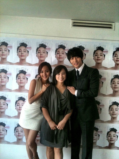 사진은 유진의 ‘겟잇뷰티’ 출간기념회 및 결혼 발표 공식 기자회견이 열린 23일 촬영된 것으로, 유진과 기태영, 유진의 어머니 고연희 씨의 모습을 담고 있다.