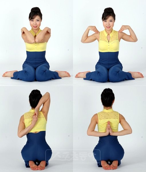 4. 양손을 등 뒤에서 합장하고 복식호흡을 병행한다.