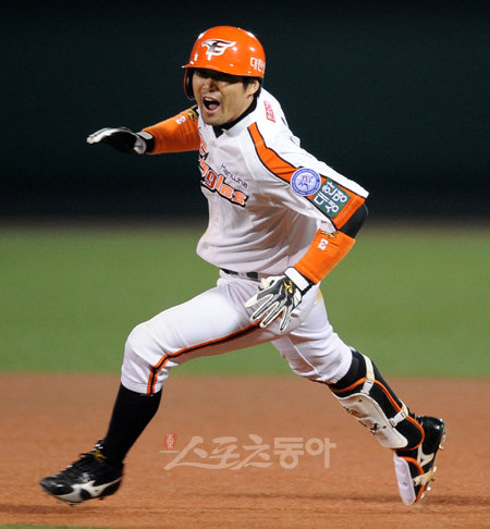 한화 강동우가 24일 SK전 9회말 투아웃에서 끝내기 안타를 터뜨린 직후 포효하며 그라운드를 달리고 있다.
