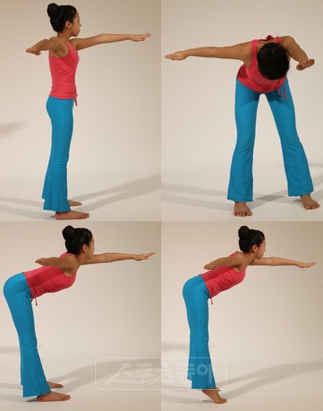 2. 상체를 90도로 숙이고 고개는 들어 시선은 정면을 바라본다. 10초 정지.