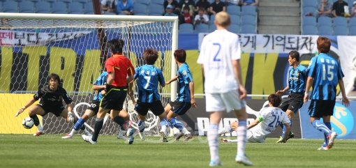 29일 인천 월드컵경기장에서 열린 프로축구 인천 유나이티드와 수원 삼성의 경기에서 전반전 수원 염기훈이 동점골을 넣고 있다.