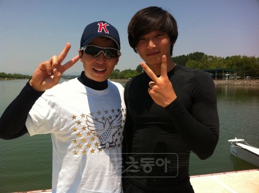 2AM 멤버 정진운(@2AMjinwoon·오른쪽)이 유재석과 함께 조정 연습에 빠진 사진을 공개했다. 정진운은 29일 트위터에 “재석 형님과 조정연습! 제대로 조정을 느낄 수 있어요”라는 글과 함께 유재석과 브이자를 그리며 미소 지은 사진을 올렸다. 정진운은 MBC ‘무한도전’ 조정 특집에서 멤버로 합류해 연습에 한창이다. 누리꾼들은 ‘스포츠인의 포스가 느껴지네요’ ‘날씨도 더운데 고생이 많다’며 격려했다.