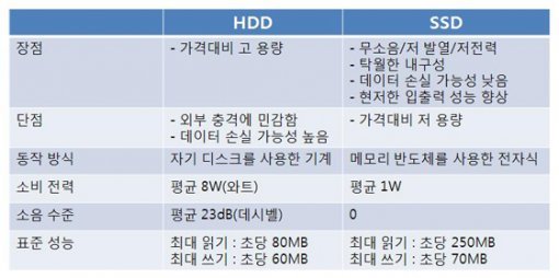 특히 SSD에 주목하자. 하드디스크(HDD)가 ‘Hard Disk Drive’의 약자라면, SSD는 ‘Solid State Drive’의 약자다. 약자에서 보듯 SSD에는 디스크(disk)가 없다. 하드디스크는 내부에 있는 디스크가 고속으로 회전(분당 5,000~7,000회)하며 데이터를 쓰고 읽는다. 고속이라 해도 데이터 입출력 성능에 한계가 있고 그로 인한 소음과 발열도 적지 않다. 반면 SSD는 디스크가 아닌 메모리 반도체를 사용하므로 디스크에 비해 데이터 입출력 속도가 월등히 빠르다. 디스크 회전이 없으니 당연히 소음도 발열도 없다. 그래서 하드디스크에 비해 에러, 오류, 장애 발생 가능성도 대단히 낮다(HDD/SSD의 장단점 비교는 하단 표 참고).