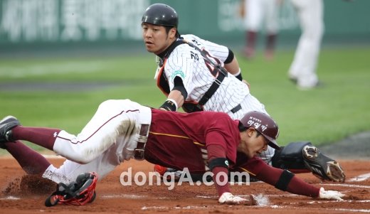 태그보다 손이 빨랐다. 넥센 김민우(앞)가 2일 사직 롯데전에서 1회초 1사 2루에 있다 후속 조중근 적시타 때 홈까지 쇄도, 세이프되고 있다. 롯데 포수는 강민호.