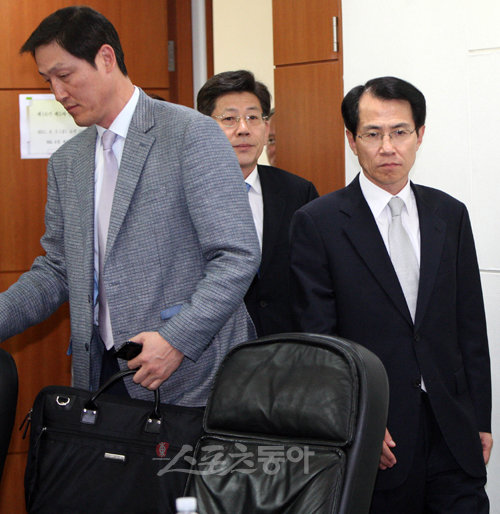 한국프로농구연맹(KBL) 임시총회가 3일 오후 강남구 논현동 KBL센터에서 열렸다. 지난 1일 KBL 총재 경선에서 후보로 나선 전육 現총재와 한선교 한나라당 의원이 5차 투표까지 접전끝에 당선자가 나지 않자 재투표를 하기로 결정한 것. 10개구단 단장들이 회의장으로 들어서고 있다.