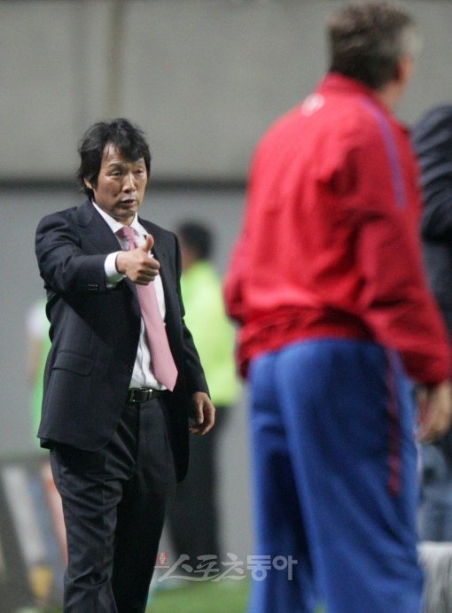 3일 오후 8시 서울월드컵경기장에서 열린 한국 축구대표팀과 세르비아의 평가전 경기에서 조광래 감독이 엄지를 치켜들고 있다.