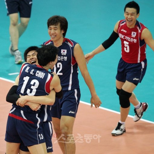 5일 오후 2시 수원 실내체육관에서 열린 ‘2011월드리그 국제남자배구대회’ 대륙간라운드 D조 4차전 한국 대 프랑스 경기에서 공격에 성공한 한국의 최홍석(13번)과 전광인이 부둥켜 안고 있다.
