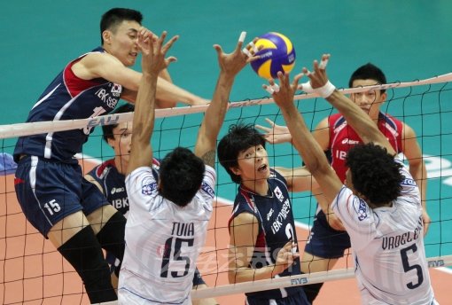 5일 오후 2시 수원 실내체육관에서 열린 ‘2011월드리그 국제남자배구대회’ 대륙간라운드 D조 4차전 한국 대 프랑스 경기에서 한국 하현용이 상대 수비벽을 피해 공격하고 있다.