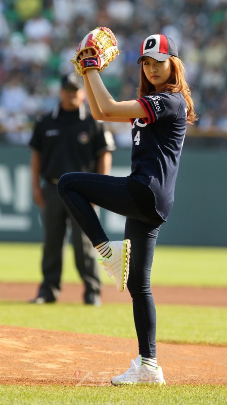 5일 서울 잠실야구장에서 열린 삼성 라이온즈와 두산 베어스의 경기에서 걸그룹 포 미닛 남지현이 시구하고 있다.