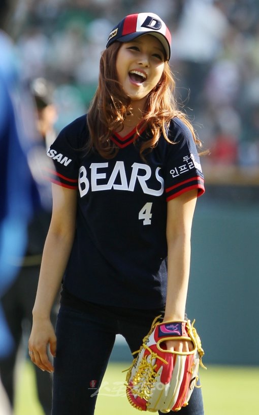 5일 서울 잠실야구장에서 열린 삼성 라이온즈와 두산 베어스의 경기에서 걸그룹 포 미닛 남지현이 시구한후 깜찍한 표정을 짓고 있다.