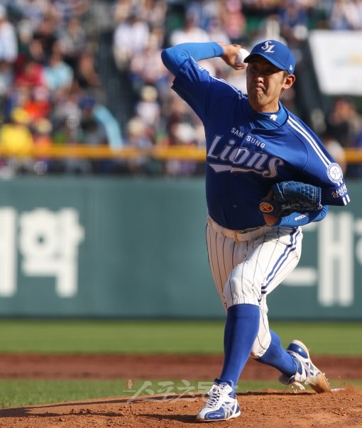 5일 서울 잠실야구장에서 열린 삼성 라이온즈와 두산 베어스의 경기에서 삼성 선발 투수 카도쿠라가 역투하고 있다.