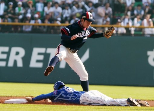 5일 서울 잠실야구장에서 열린 삼성 라이온즈와 두산 베어스의 경기에서 1회초 삼성 공격, 무사 1루 주자 배영섭이 박한이 타석 때 2루 도루에 성공하고 있다.