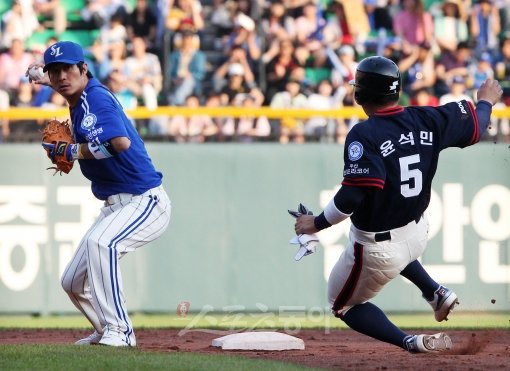 5일 서울 잠실야구장에서 열린 삼성 라이온즈와 두산 베어스의 경기에서 4회말 두산 공격, 2사 1루 상황에서 삼성 신명철이 윤석민을 포스아웃시킨후 1루로 송구하고 있다.