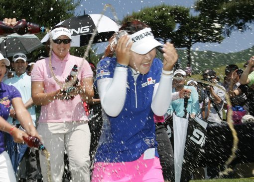 5일 열린 우리투자증권 레이디스 챔피언십에서 데뷔 5년 9개월 맛에 첫 승을 올린 윤슬아를 향해 동료들이 샴페인을 뿌리며 축하해주고 있다(큰 사진). 윤슬아가 우리투자증권 레이디스 챔피언십에서 우승한 뒤 트로피에 입을 맞추고 있다.