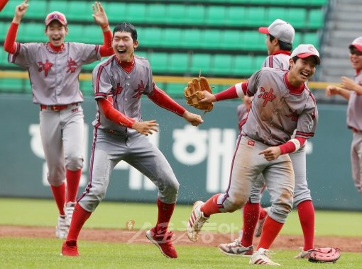 6일 오후 서울 잠실야구장에서 황금사자기 광주일고와 충암고 결승전이 열렸다. 6대 1로 승리한 충암고 선수들이 경기 종료 후 그라운드에서 기쁨을 나누고 있다.