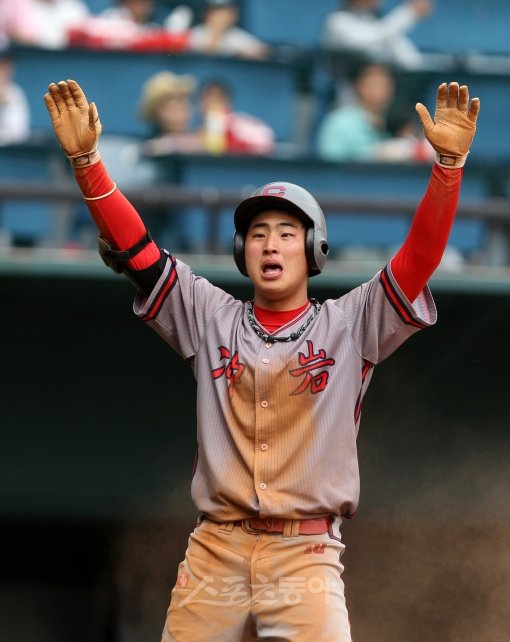 6일 오후 서울 잠실야구장에서 열린 황금사자기 광주일고와 충암고 결승에서 8회초 충암고 공격, 2사 3루 상황에서 충암고 김병재가 인사이드파크홈런을 치고 홈에서 환호하고 있다.