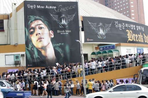 7일 오후 서울 중구 장충동 장충체육관에서 열리는 ‘김현중 미니앨범 발매 기념 쇼케이스’를 보기 위해 아시아 각 지에서 몰려든 팬들이 긴 줄을 서 입장을 기다리고 있다.