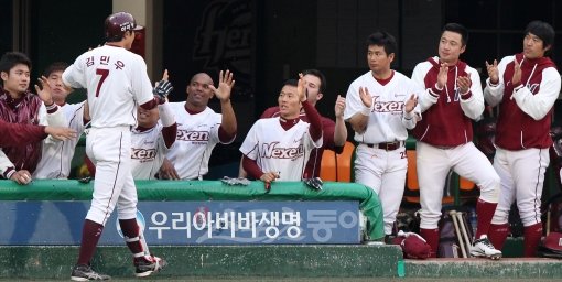 7일 서울 목동야구장에서 열린 프로야구 SK와 넥센의 경기에서 3회말 넥센 공격, 무사 무주자 상황에서 넥센 김민우가 좌월 솔로 홈런을 치고 덕아웃에서 동료들의 축하를 받고 있다.