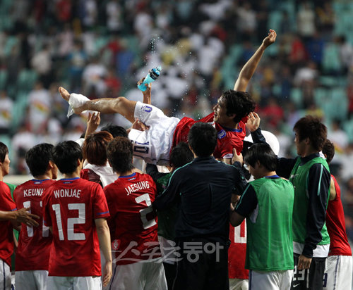 가나와의 평가전에서 지동원의 선제골과 구자철의 결승골에 힙입어 2-1로 승리한 한국대표팀 선수들이 경기 종료 직후 그라운드에서 주장 박주영의 결혼을 축하하는 헹가래를 하고 있다. 전주ㅣ박화용 기자 (트위터 @seven7sola) inphoto@donga.com