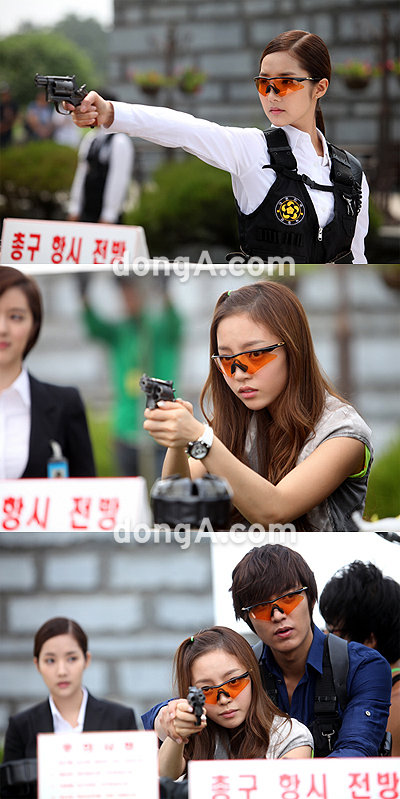 지난 2일 파주 벽초지 수목원 안에 마련된 사격 세트장에는 박민영과 구하라가 사격을 위한 만반의 준비를 갖춘 채 모습을 드러냈다. 사격용 안경과 조끼, 귀마개 등을 착용한 모습이 흡사 전문 사격 선수를 방불케 할 정도.