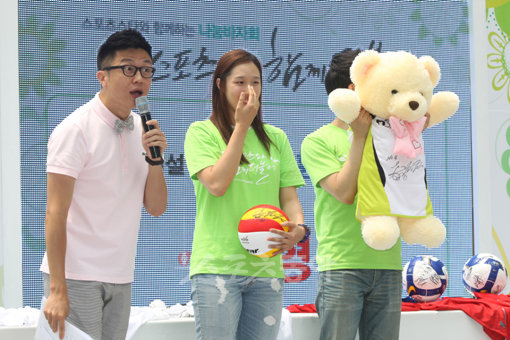 8일 오후 서울시 청계광장에서 열린 '스포츠 스타와 함께 하는 나눔바자회'에서 배구 선수 황연주가 자신의 애장품을 경매하고 있다.