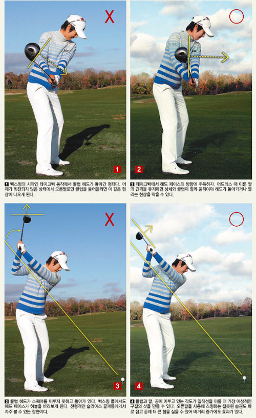 아마추어 골퍼들의 스윙을 살펴보면 슬라이스의 원인이 몇 가지로 압축된다. 그중 하나가 백스윙과 다운스윙 때 클럽 헤드의 궤도다.