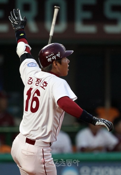 9일 서울 목동야구장에서 열린 프로야구 SK 와이번즈와 넥센 히어로즈의 경기에서 2회말 넥센 공격 2사 1,2,3루 상황에서 넥센 강정호가 만루 홈런을 날리고 있다.