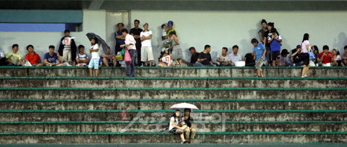 비가 내리면 마산의 야구팬들은 전광판 아래로 옹기종기 모여 앉았다. 마산의 열악한 구장현실을 극명하게 보여주는 장면이다. 스포츠동아DB
