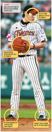 ▲(a) 투수판에 중심발(축족)을 대고 있는 투수가 투구와 관련된 동작을 일으키다가 투구를 중지하였을 때→자유발(자유족)을 흔들어 투수판 뒤끝을 넘게 되면(와인드업) 타자에게 투구하지 않으면 보크다(8일 임찬규가 범한 보크 동작과 관련 있는 조항이다. 자유발인 왼발이 투수판 뒤끝을 넘는 와인드업 자세를 취했을 때는 무조건 축족을 빼지 않고 투구해야 한다. 단, 양발을 투수판 앞에 가지런히 놓고 정지한 뒤 던지는 세트포지션일 때는 이와 같은 동작이라도 보크가 아니다).