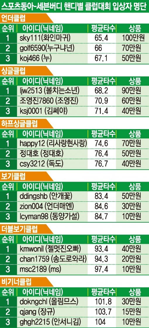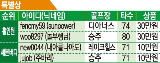 싱글클럽(73∼81타)에서는 평균 68.2타를 친 ljw2513이 조영진7860(70.9타)을 제치고 1위에 올랐고, 하프싱글클럽(82∼90타)에서는 happy12가 74.6타로 정대호(76.4) 씨를 꺾었다.