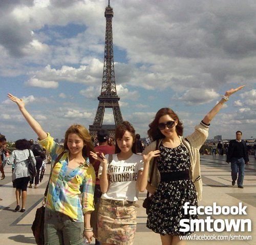 공연차 프랑스 파리로 날아간 소녀시대 멤버 효연 제시카 서연(왼쪽부터)이 에펠탑을 배경으로 기념촬영을 하고 있다.