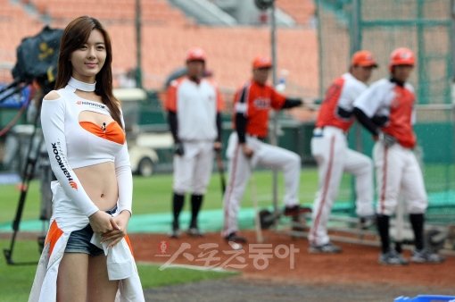 10일 부산사직야구장에서 열린 롯데자이언츠 대 한화이글스 경기 전 레이싱걸이 방송촬영을 하자 한화 선수들이 바라보고 있다.