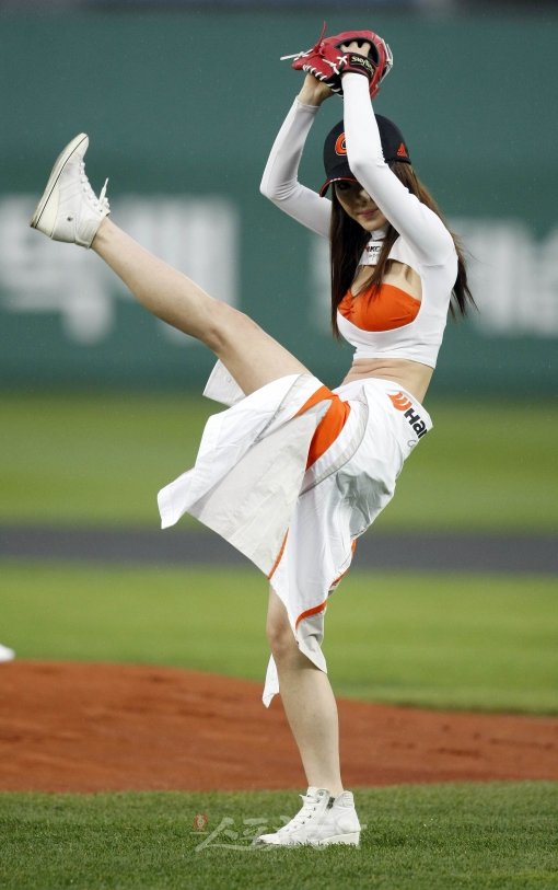 10일 부산사직야구장에서 열린 롯데자이언츠 대 한화이글스 경기 전 레이싱걸 윤승연이 시구를 하고 있다.