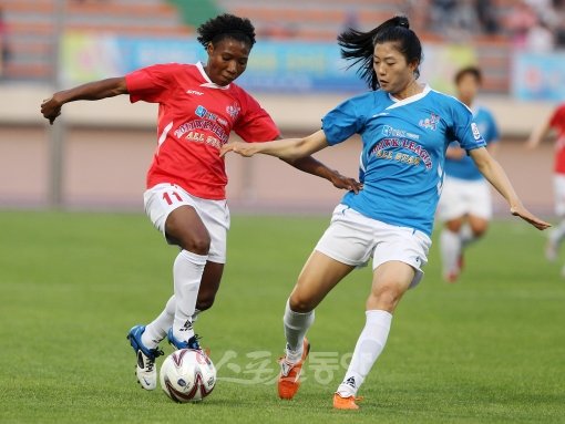 13일 충북 보은 종합운동장에서 열린 '2011 WK리그 올스타전' 가이아팀과 아테나팀의 경기에서 가이아 쁘레치냐와 아테나 심서연이 볼을 다투고 있다.