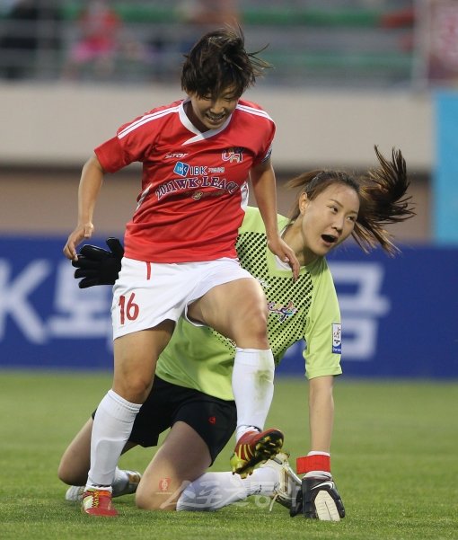 13일 충북 보은 종합운동장에서 열린 '2011 WK리그 올스타전' 가이아팀과 아테나팀의 경기에서 가이아 권하늘이 역전골, 팀의 세번째 골을 넣고 있다.